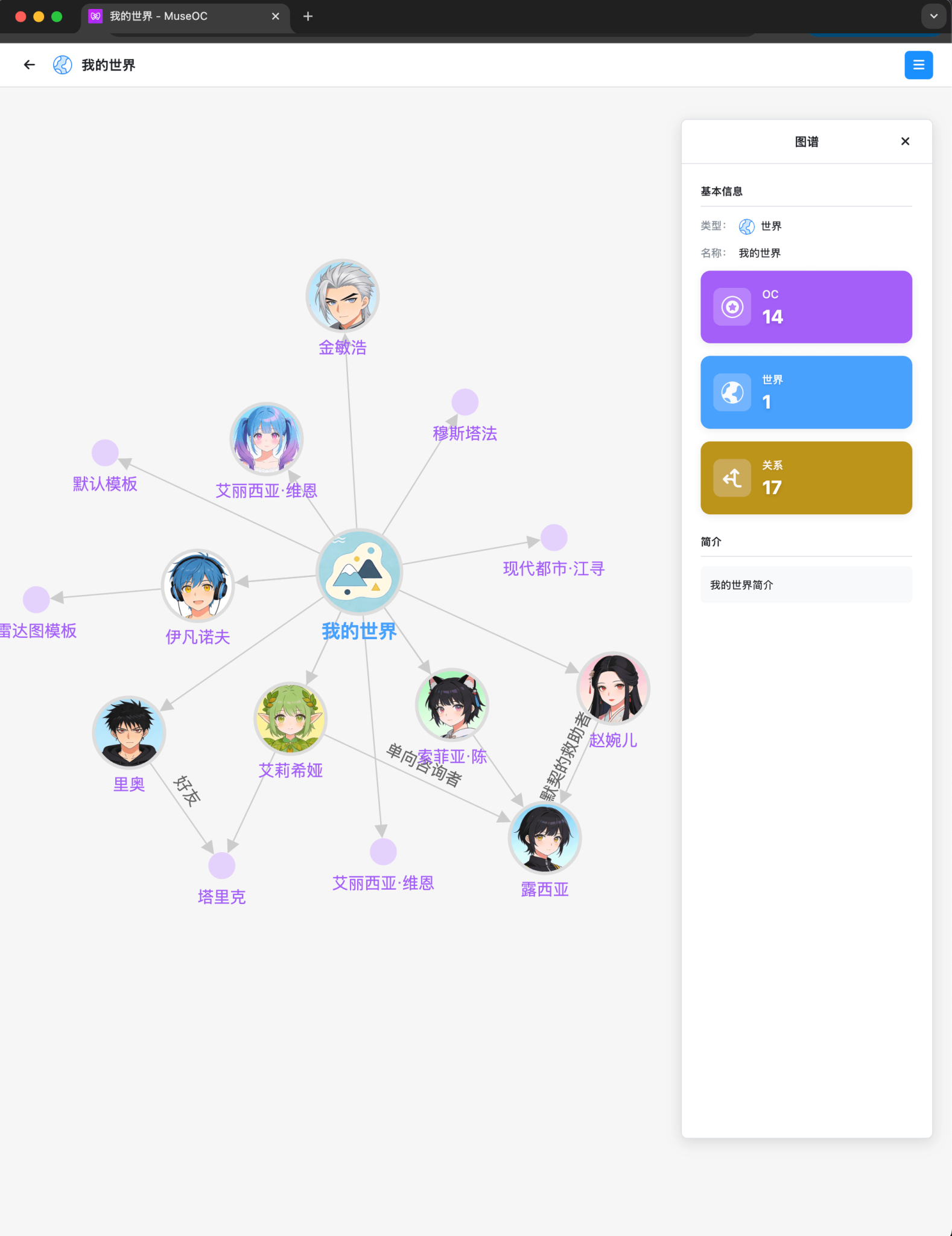在单独的关系网页面中,能看到全部OC和相互之间的关系连线。